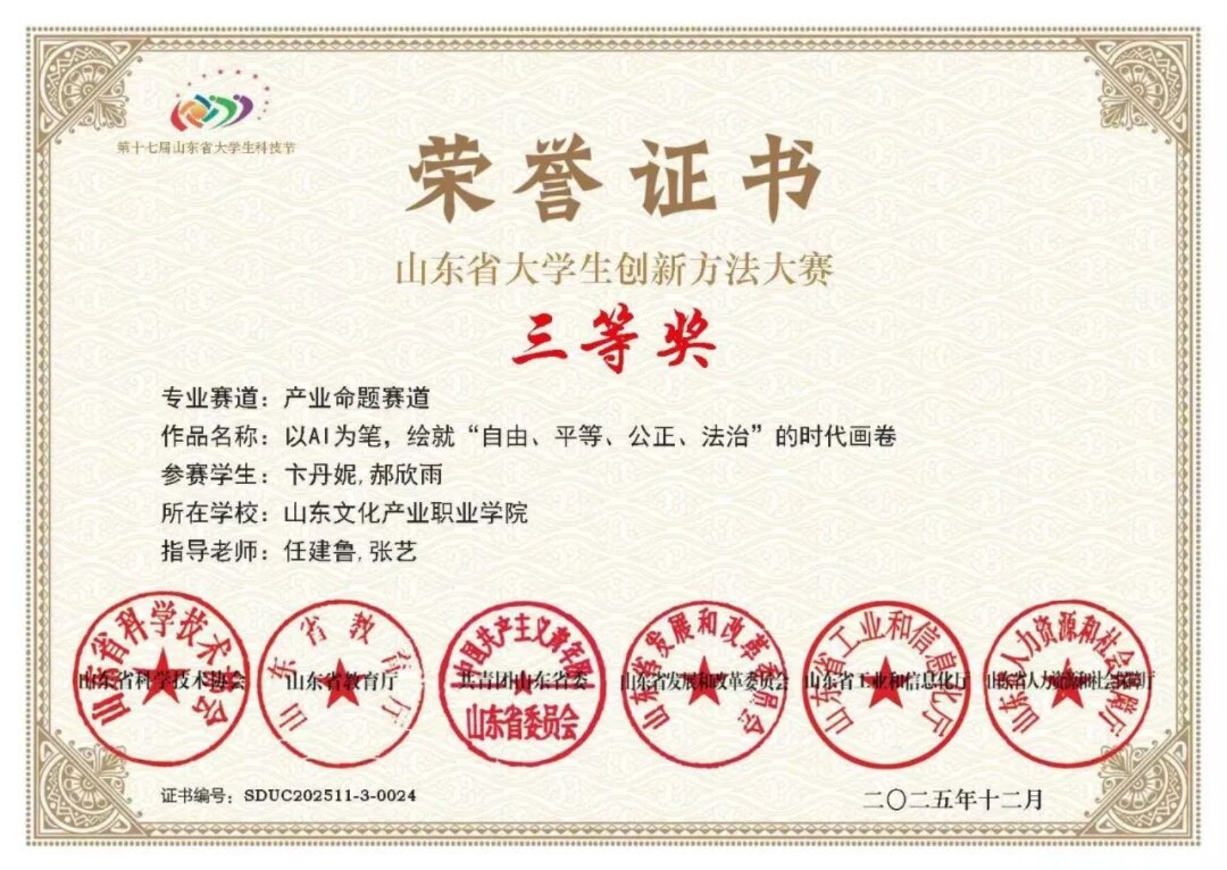 近日,在第十七届山东省大学生科技节“大学生创新方法大赛”中,山东文化产业职业学院师生表现卓越,脱颖而出,成功斩获省级二等奖2项、三等奖1项。这一优异成绩,充分彰显了我校在创新教育领域的扎实功底与丰硕成果。