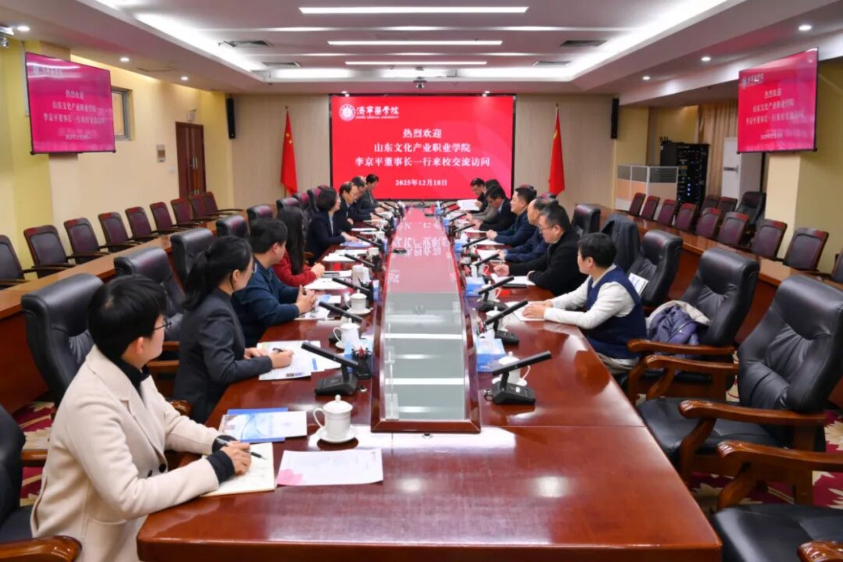 为深化校际合作、借鉴办学经验,共话产教融合与区域发展新机遇,12月18日,学校董事长李京平、校长曹胜强率队赴济宁医学院开展交流访问,济宁医学院党委书记卢国华、党委副书记张贤雷等领导热情接待了考察团。