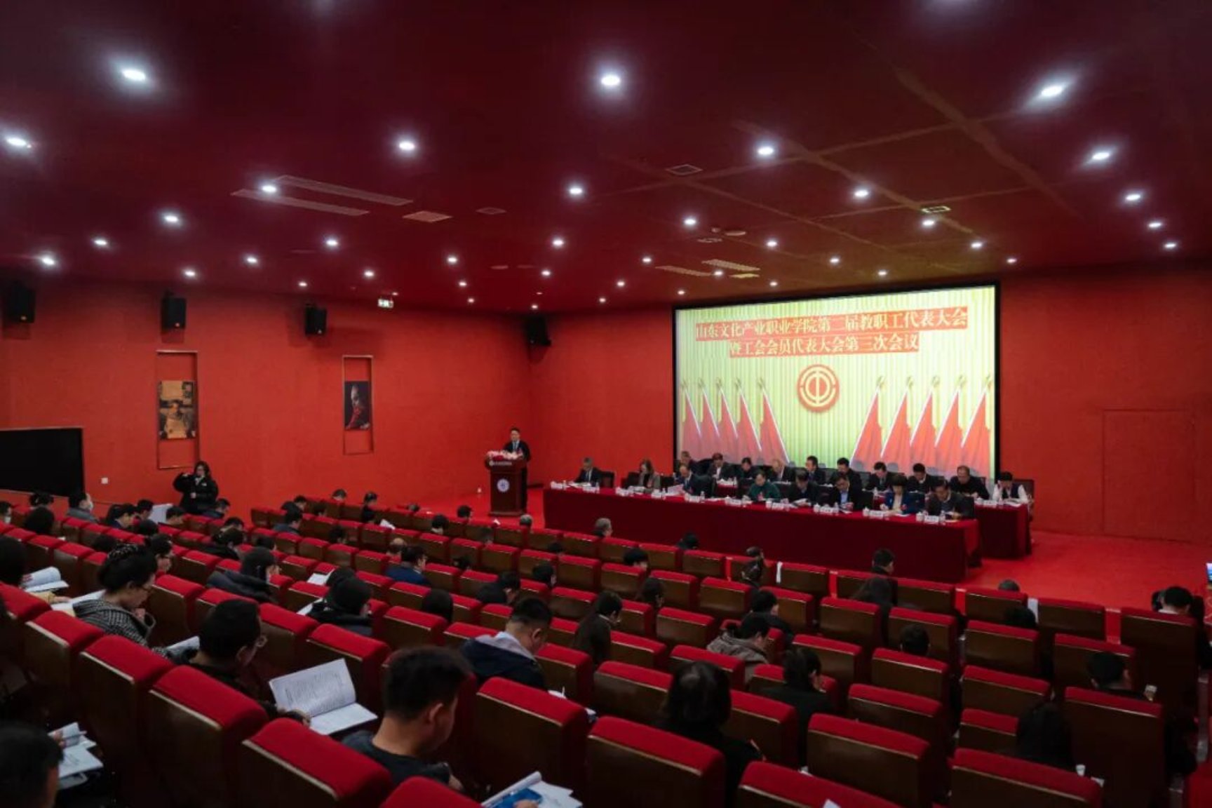 12月2日,山东文化产业职业学院第二届教职工代表大会暨工会会员代表大会第三次会议隆重开幕。学校董事长李京平,党委书记田艳玲,校长曹胜强,校领导班子成员及大会主席团成员在主席台就座。开幕式由党委副书记、副校长姜雪松主持。