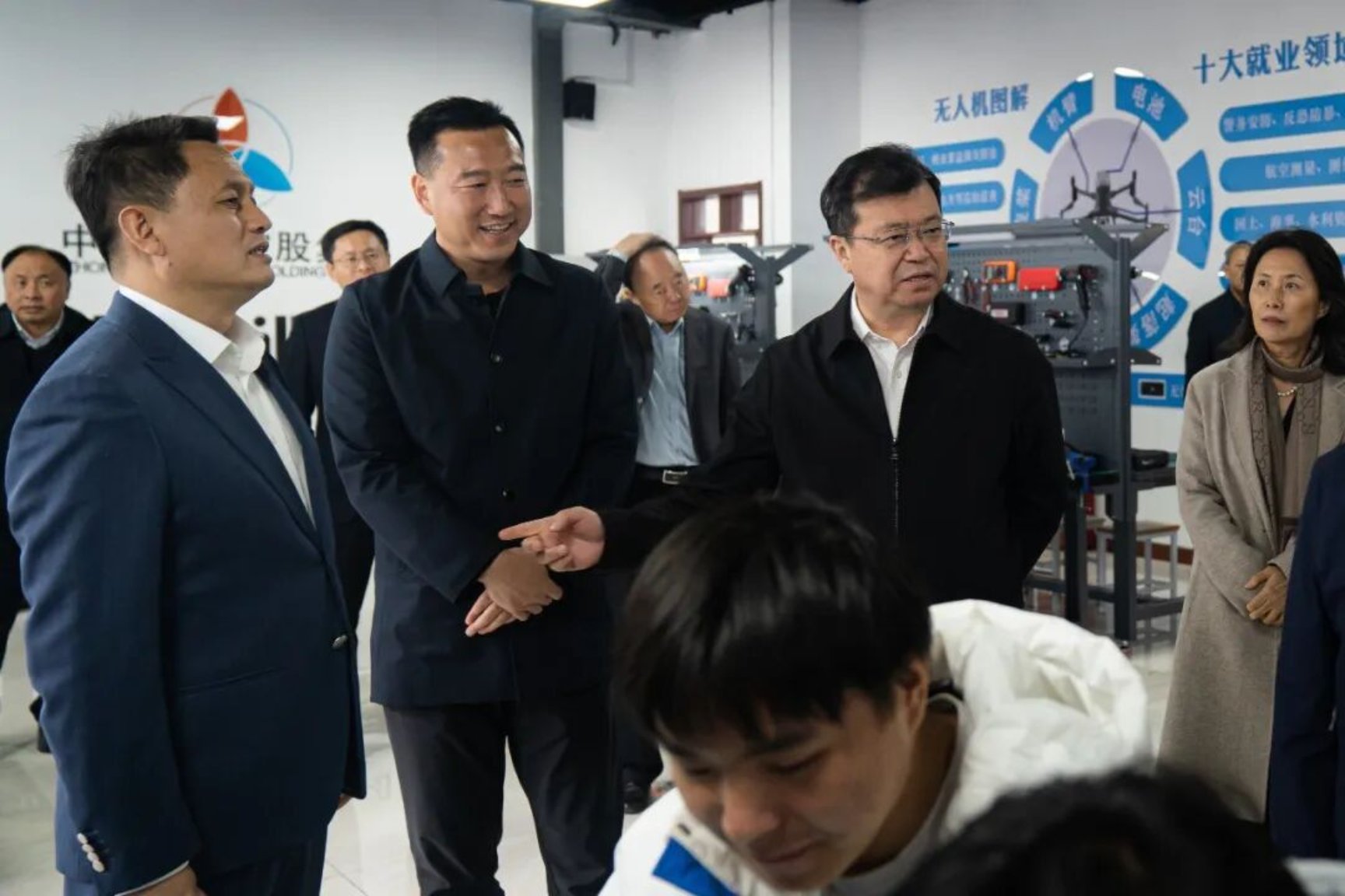 在双创中心,先后走进新能源汽车实训室、无人机产教融合基地、华为现代产业学院等处,细致察看实训设备配置、专业教学开展、产教融合推进及技术技能人才培养等情况。