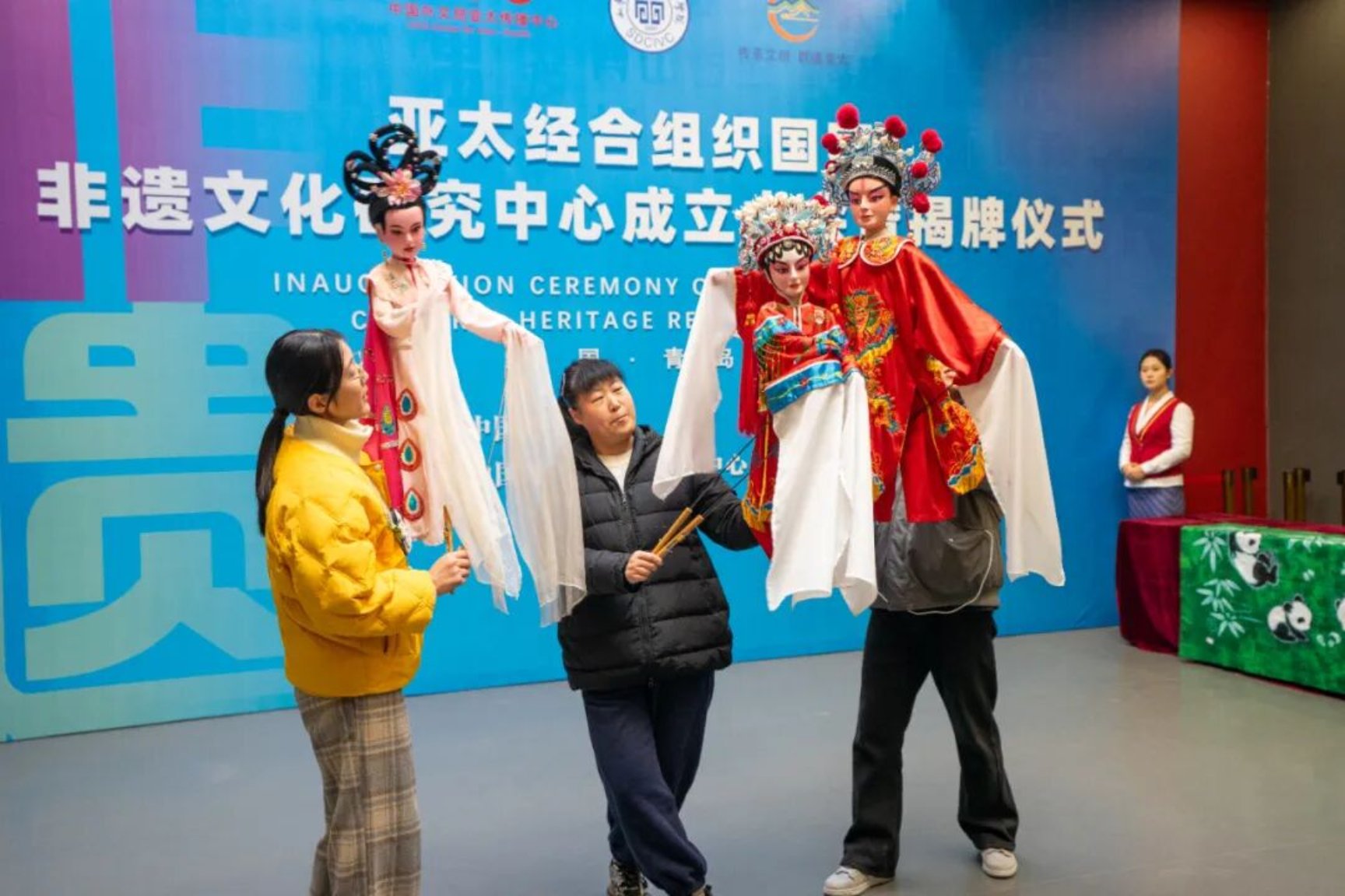 11月28日,“亚太经合组织国家非遗文化研究中心”在山东文化产业职业学院正式揭牌成立。学校在文体中心隆重举办非遗展演活动,集中展示了包括凤翔木版年画、自贡扎染、莱西木偶、马氏巧饼等在内的多项国家级、省市级非物质文化遗产项目,为观众带来一场跨越时空的文化盛宴。