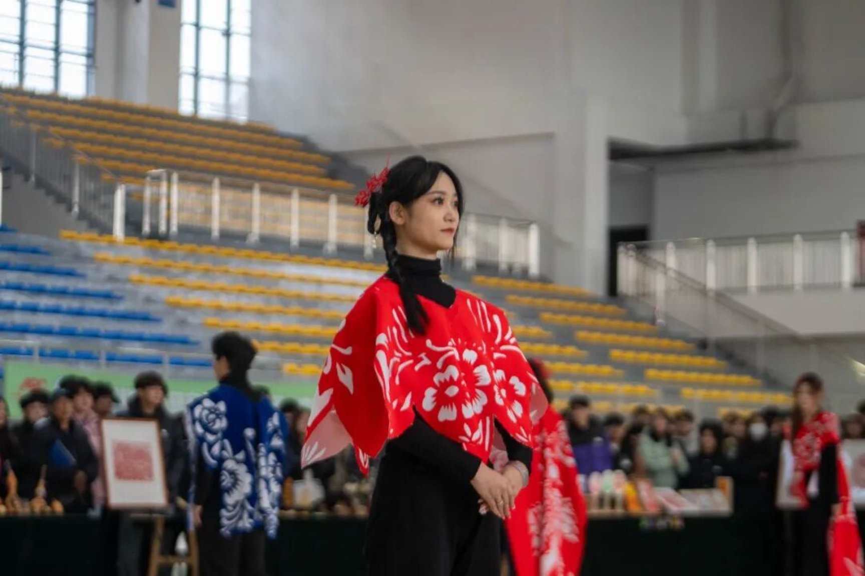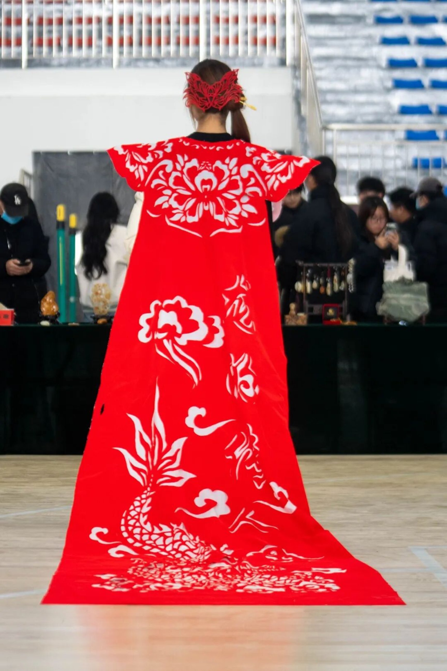 非遗剪纸服装展示环节则融合传统剪纸艺术与现代服装设计,由美术与艺术设计学院学子亲手打造。剪纸的镂空之美与对称之韵在服装上焕发新生,展现出传统技艺在现代语境下的创新表达。