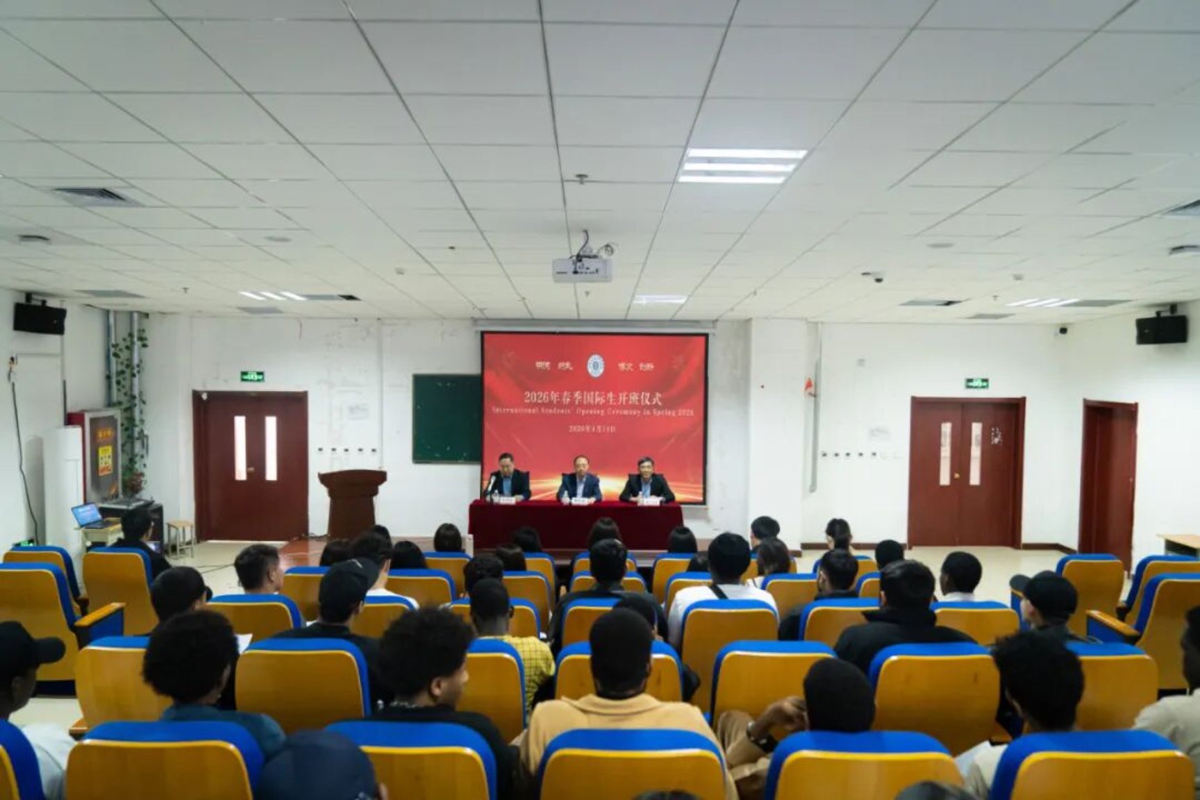 校长曹胜强,校长助理徐玉国出席仪式,国际交流与合作处(国际教育学院)处长齐登红,全体任课教师,有关工作人员及2026年春季全体国际新生参加开班式,开班式由齐登红主持。