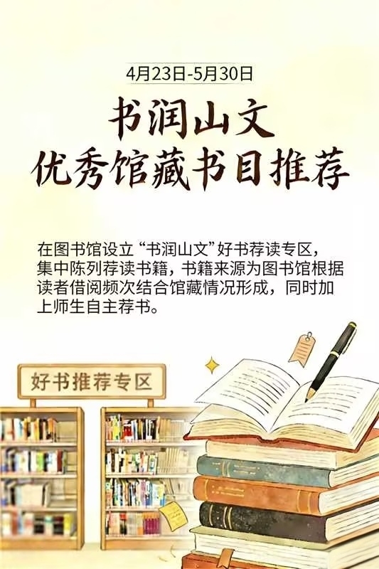 学校图书馆设置“书润山文”好书推荐专区,根据读者借阅频次结合馆藏情况,推荐30种以上优秀馆藏图书,放入“好书推荐”专区陈列,进馆借阅的师生亦可将自己喜欢的图书放入专区,集中展示推荐书籍,方便共享借阅。