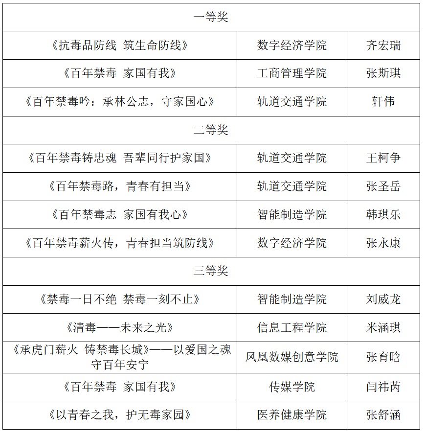 禁毒之路,任重道远;青春之力,守护家国。感谢所有参赛同学的用心创作与各学院的大力支持,让我们以获奖同学为榜样,将禁毒精神融入日常,以青春之名筑牢无毒防线,让爱国情怀在禁毒实践中熠熠生辉!