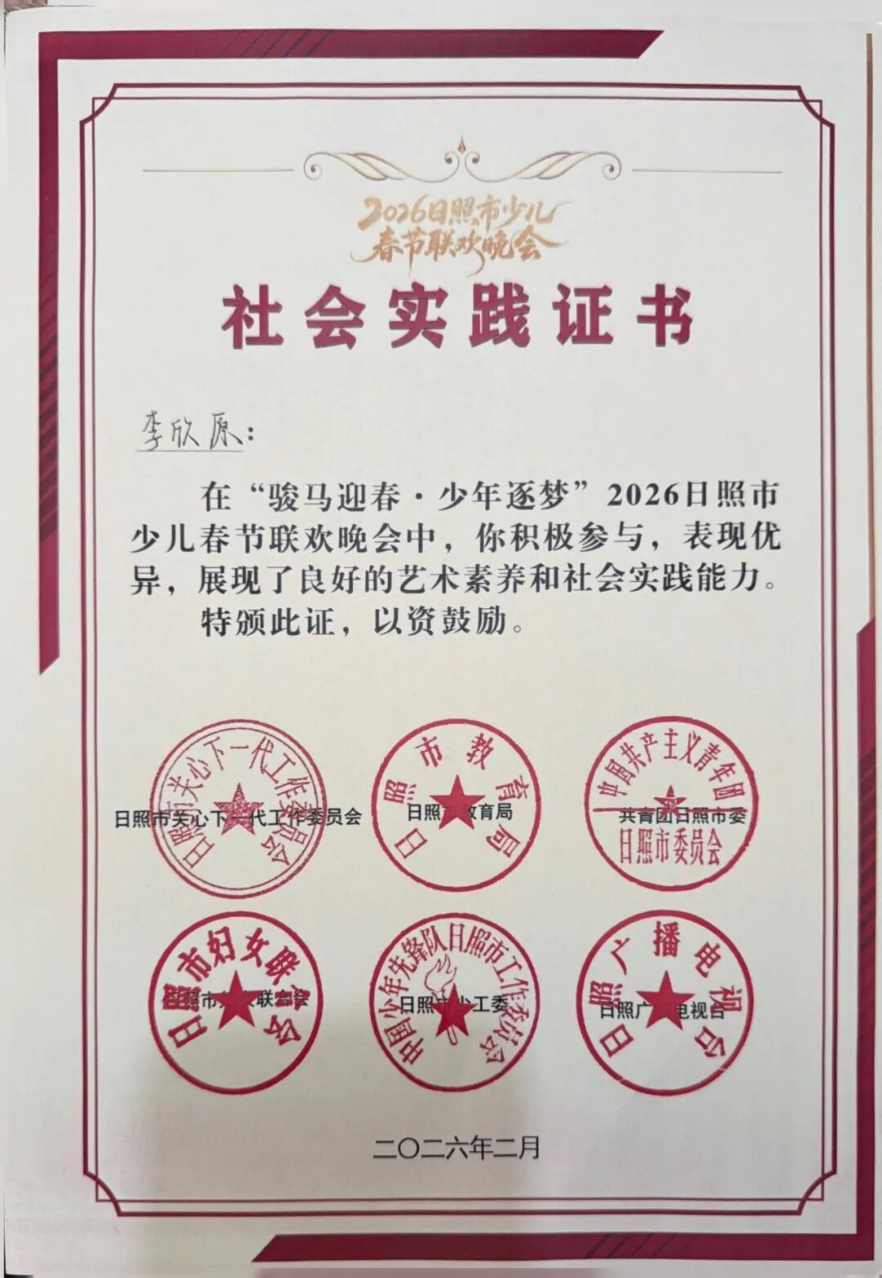 此外,李欣原还深度参与日照广播电视台2026年少儿春节联欢晚会的录制保障工作。在导控室协助监控画面、确认信号,在演播大厅调度小演员、维护秩序,在实战中洞悉广电节目全流程运作,锤炼了专业素养与应急处置能力,用传媒初心守护少年梦想。