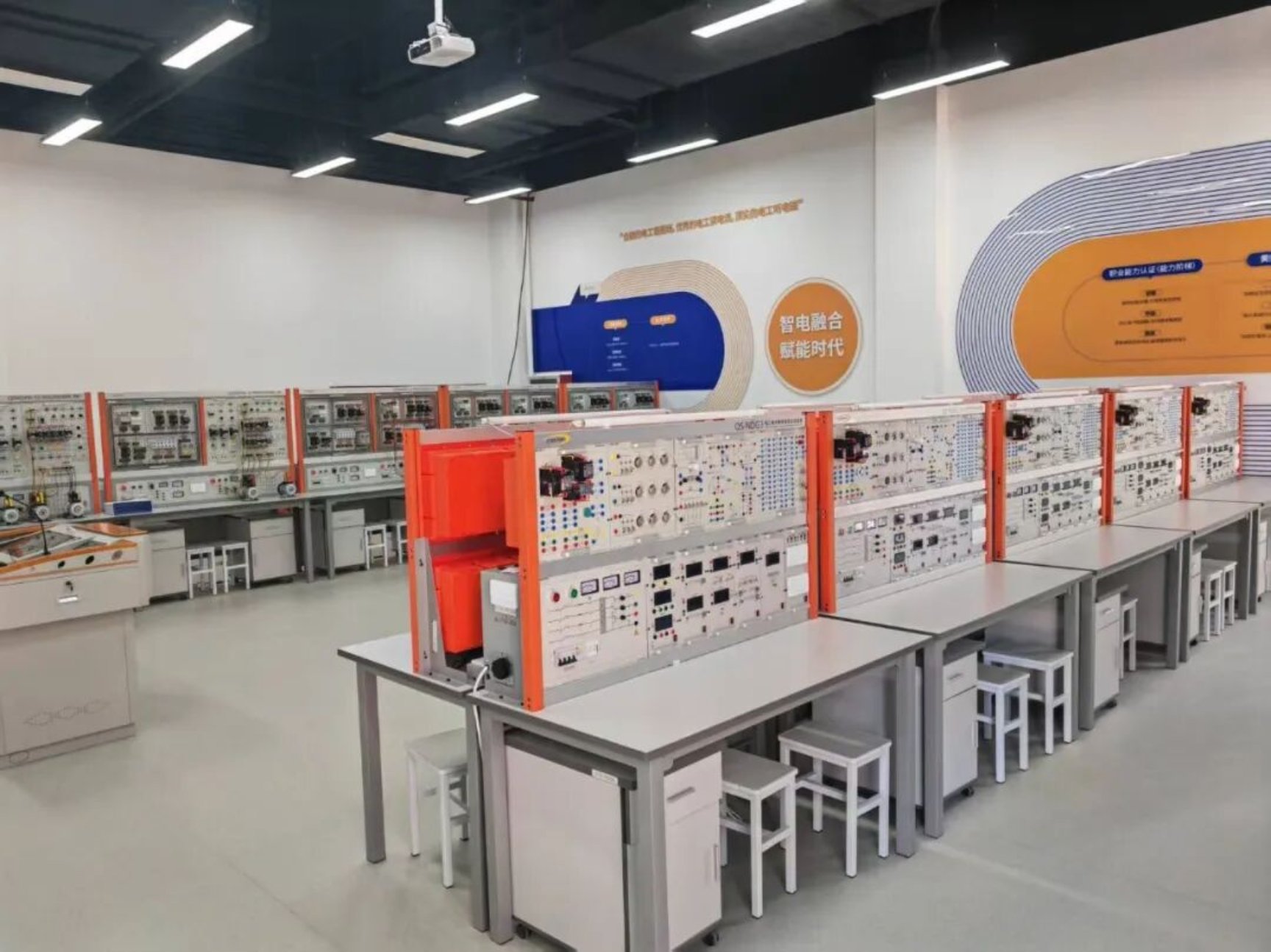 实训室秉持“安全、规范、精准”理念,采用阶梯式培育,助力学子考取维修电工中、高级证书,练就扎实技能。