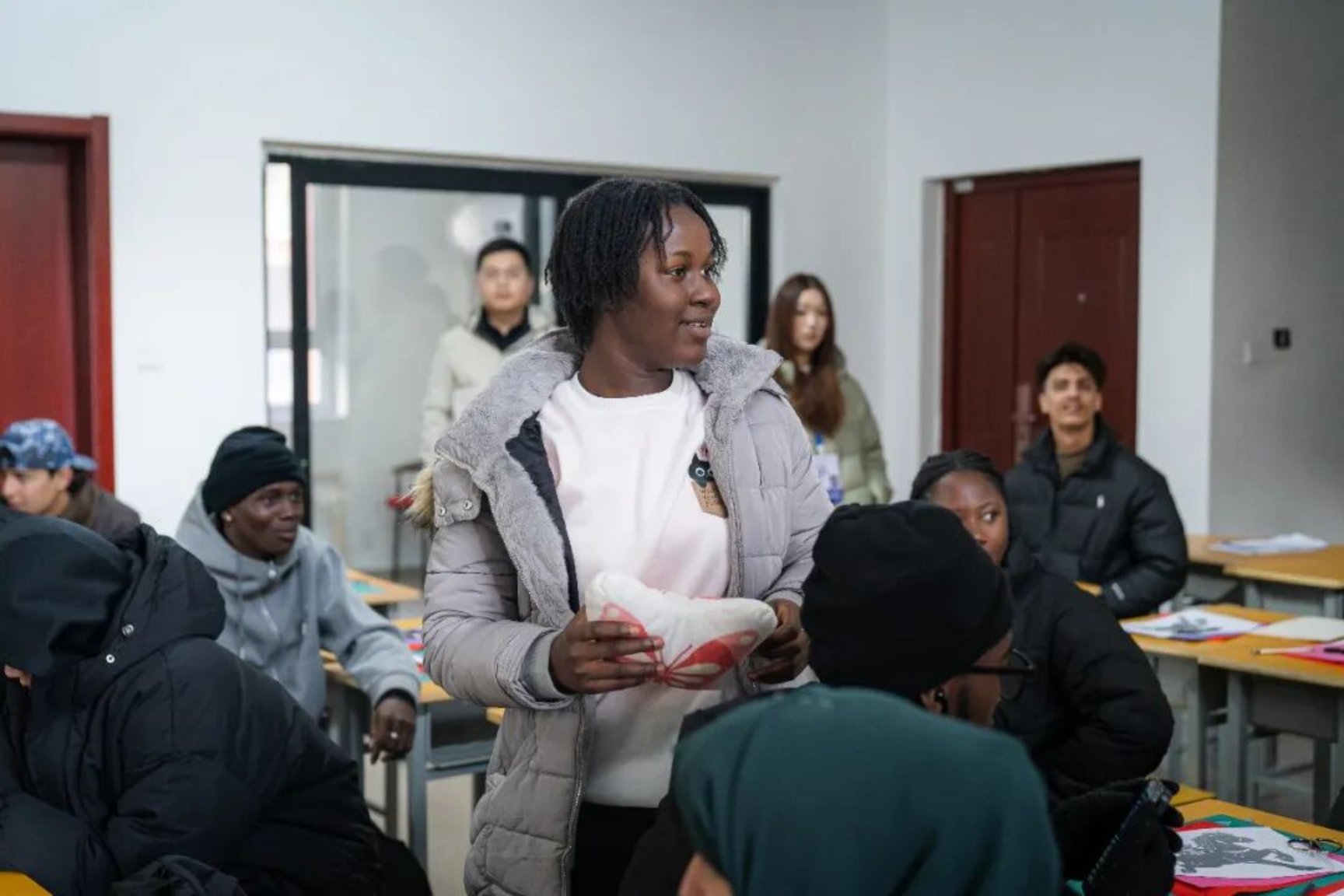 下午2时,活动正式拉开帷幕。“击鼓传花・初识非遗”环节率先登场,国际生们围坐成圈,伴着清脆鼓声传递缀有非遗元素的中国结挂件。鼓声停歇,持挂件的同学起身自我介绍,轻松愉悦的氛围迅速拉近彼此距离,为后续交流埋下伏笔。