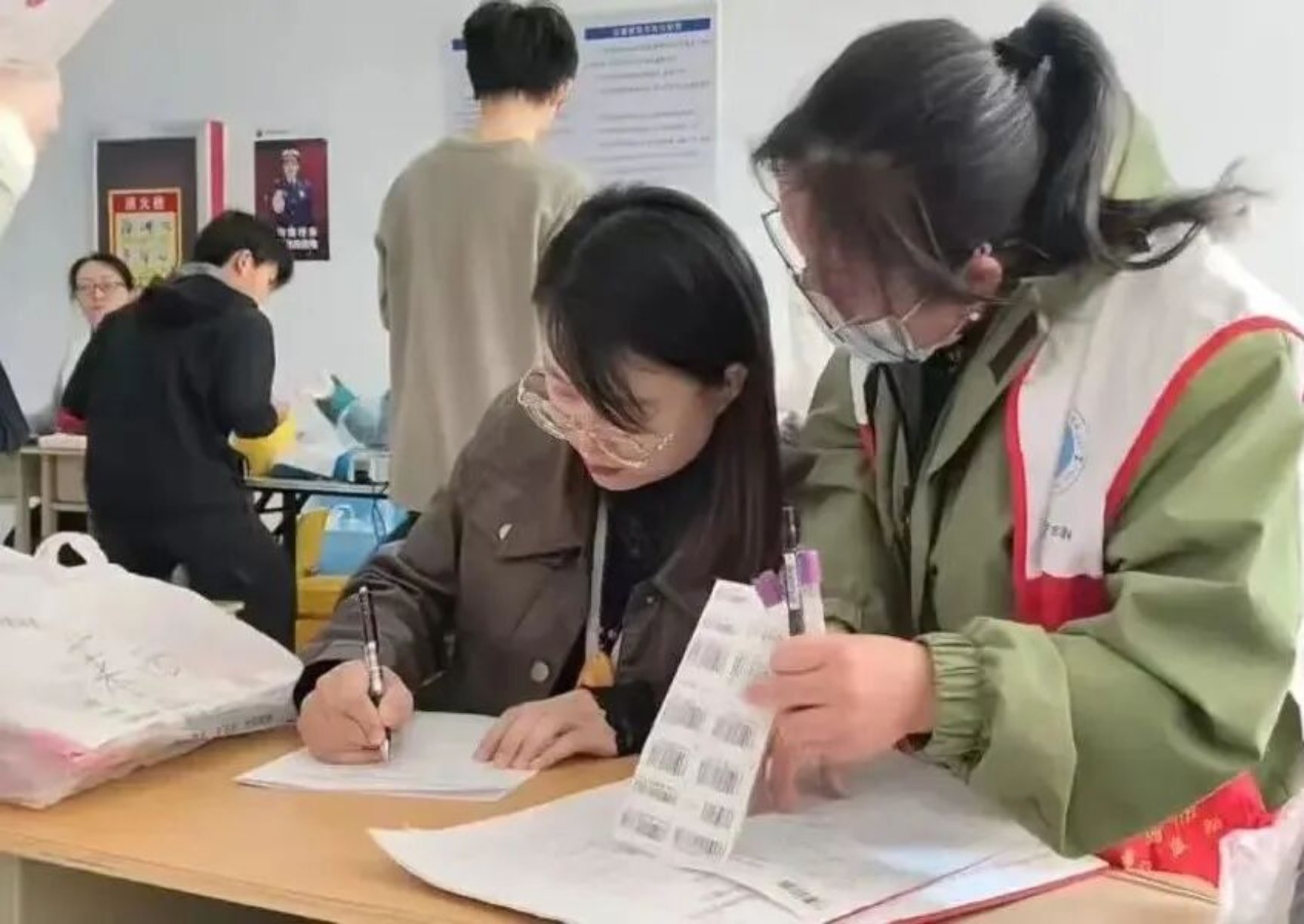 “第一次献血的时候我也紧张,扎针前偷偷攥了好几下拳头。”她一边挽起袖子,一边跟身边有些忐忑的同学聊天,“但一想到这几分钟的血,可能救一个人、一个家庭,就觉得特别值。”