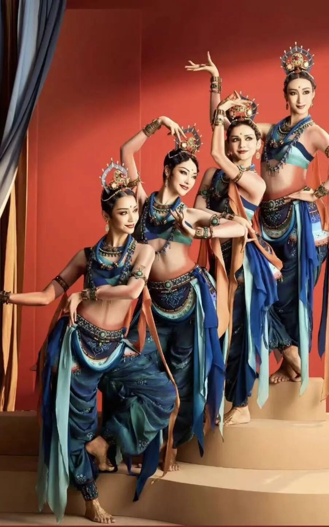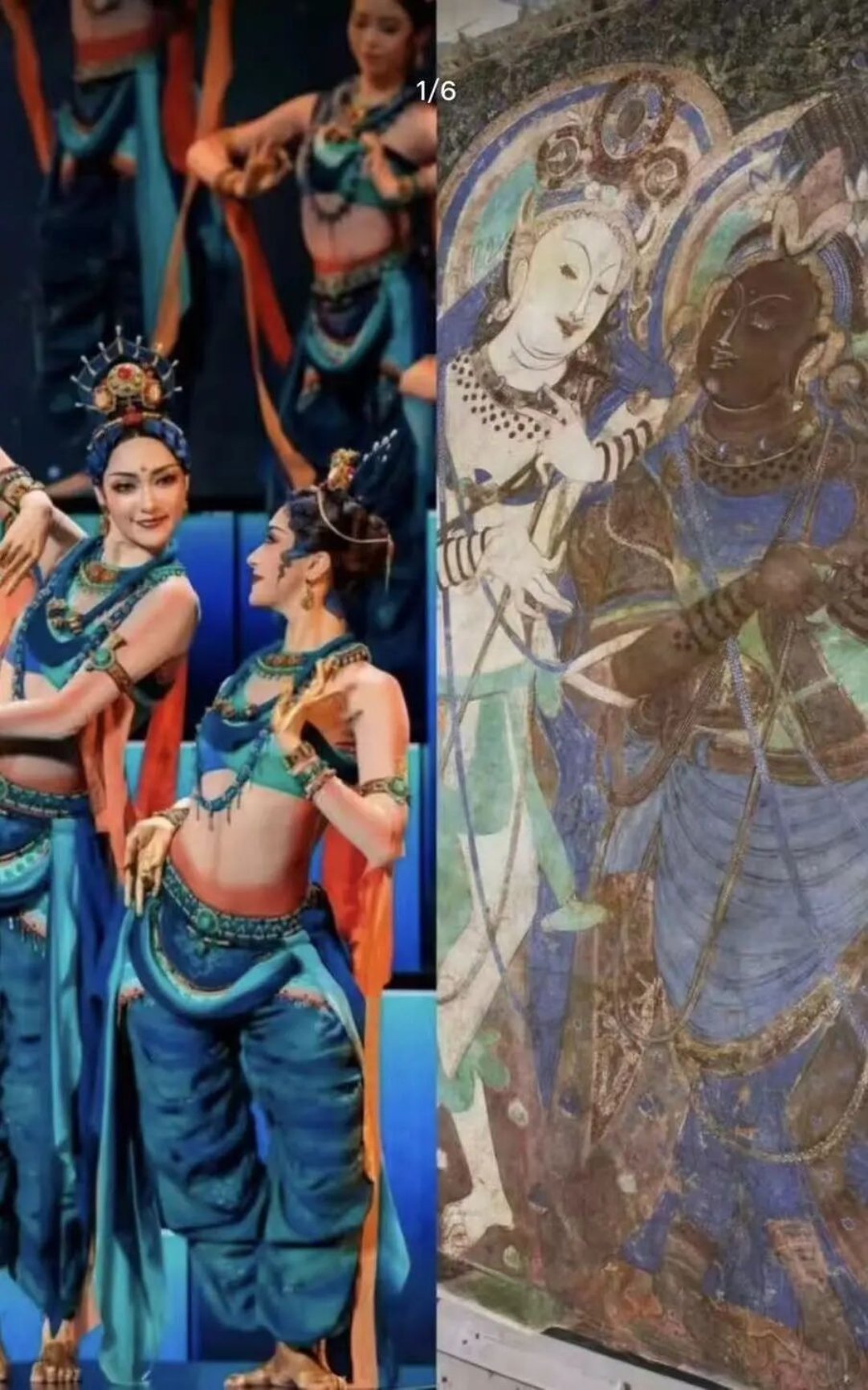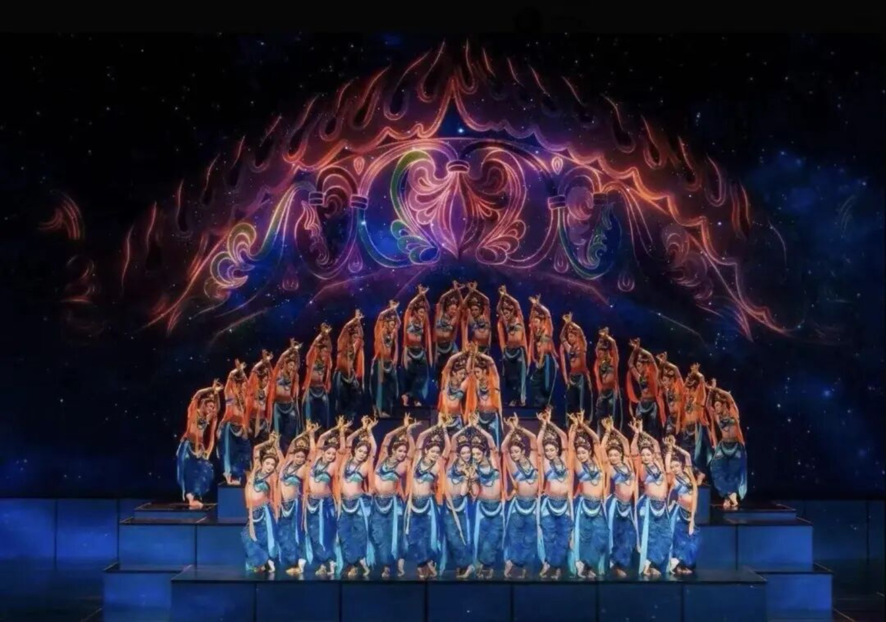 舞蹈《丝路古韵》在敦煌艺术专家常沙娜的指导下,将莫高窟与龟兹石窟中的忍冬纹、菱格纹等经典装饰图案,提炼转化为舞台视觉与服饰纹样。舞者的体态复刻了敦煌飞天的“S”形动势,背景画面则以壁画的“平涂晕染”技法为基底,将传统壁画的矿物色质感与现代光影技术结合,再现了“丝路丹青”的雄浑瑰丽。这种对传统壁画“形制”与“神韵”的双重传承,避免了简单的元素堆砌,是对“古为今用”创作理念的最佳实践。