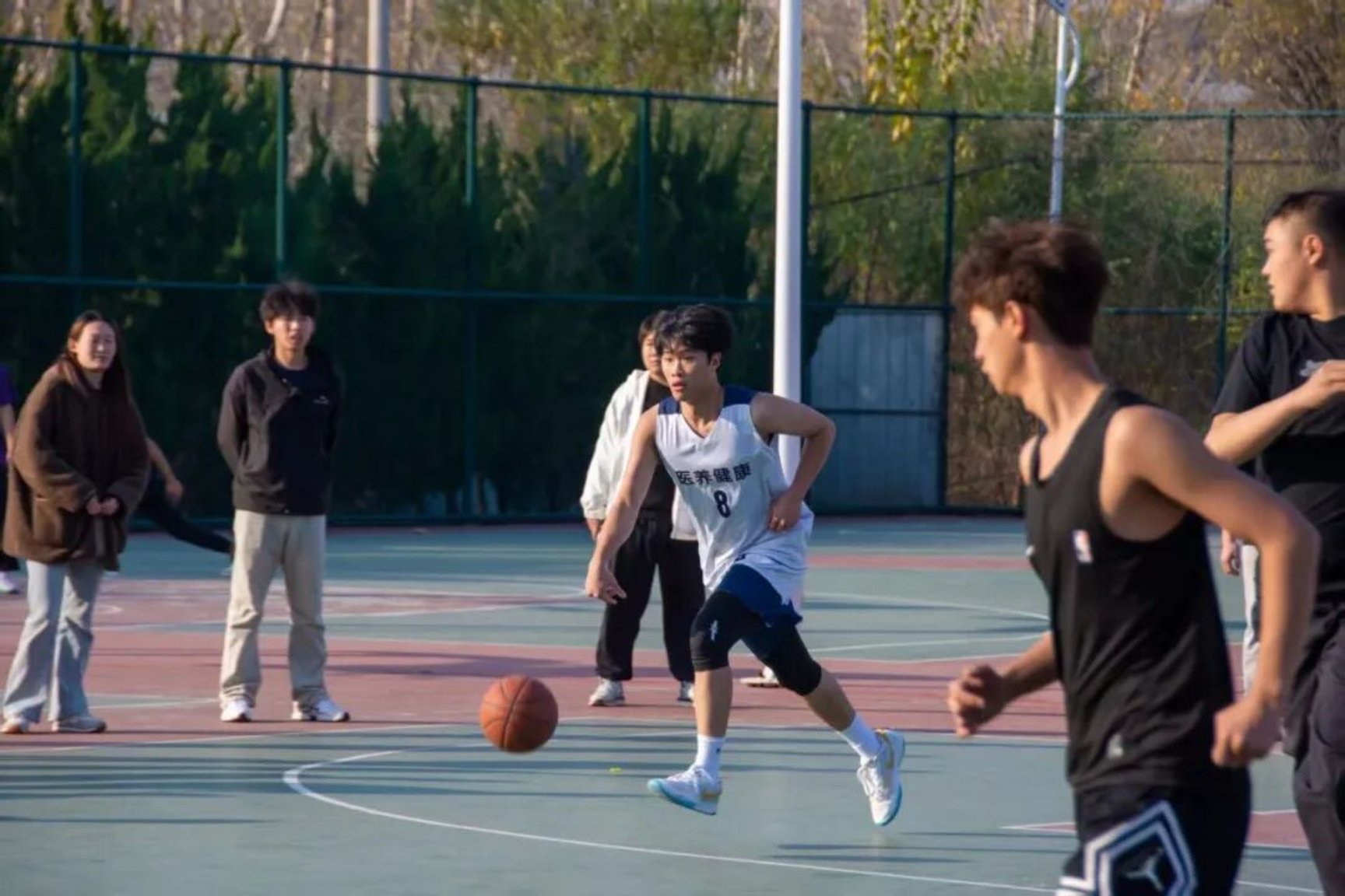 哨声一响,球员们瞬间进入状态。球员们如离弦之箭般冲向赛场,运球、突破、传球、投篮,一系列动作行云流水。持球者压低重心,目光快速扫过全场,在防守队员的围堵下灵活变向,脚步轻快如蝶,队友则默契跑位,或穿插掩护,或拉开空间,用精准的跑位为队友创造机会。