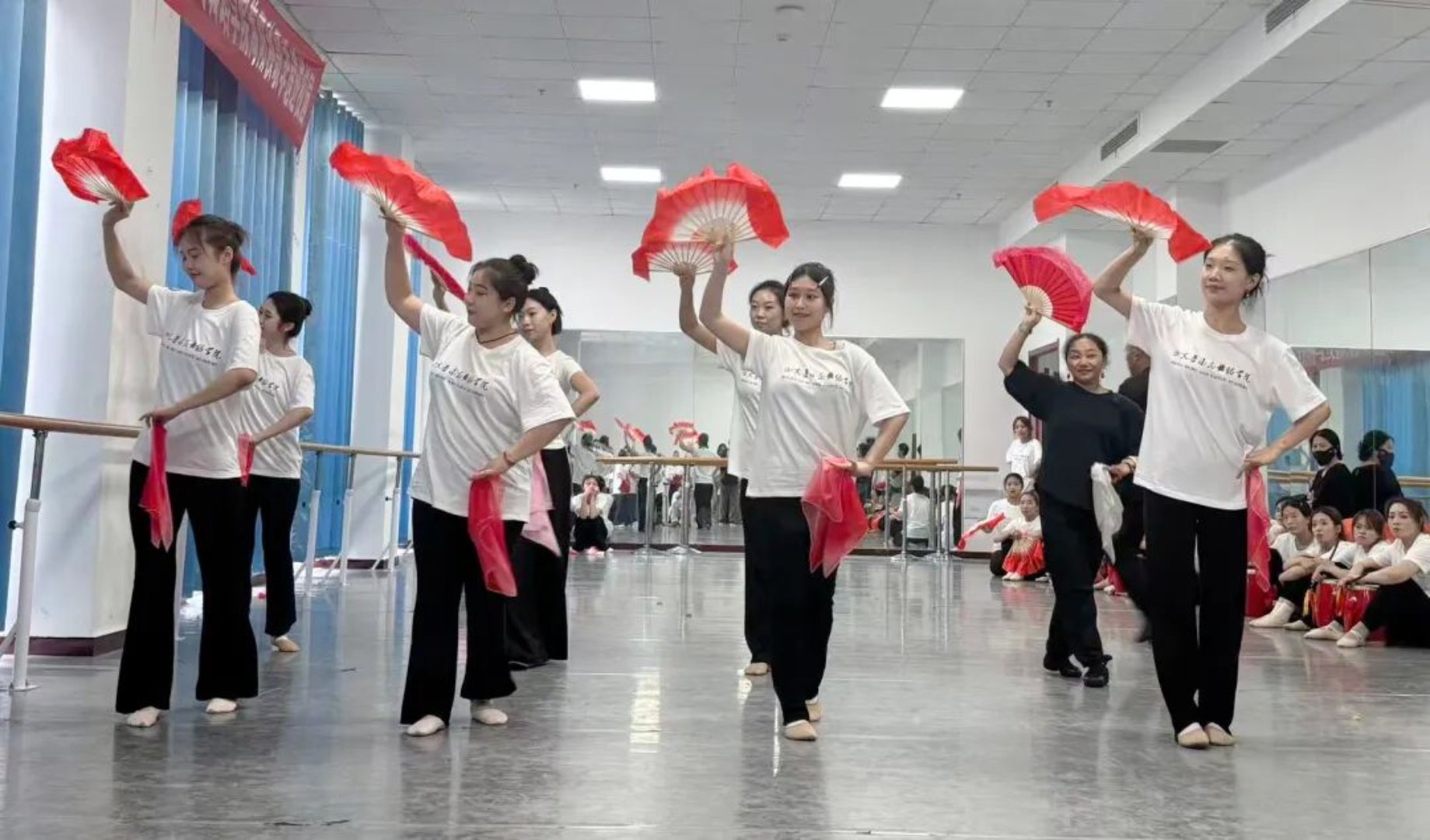 课堂上,灵动俏皮的“小嫚”们。她们踩着轻快的碎步,手腕翻飞,彩扇蹁跹,眉眼间流转着胶东小嫚的娇俏与灵动。同学们在老师的指导下领略了秧歌的动作要领,如轻盈的十字步、协调的手臂舞动和以腰为轴的扭动等。