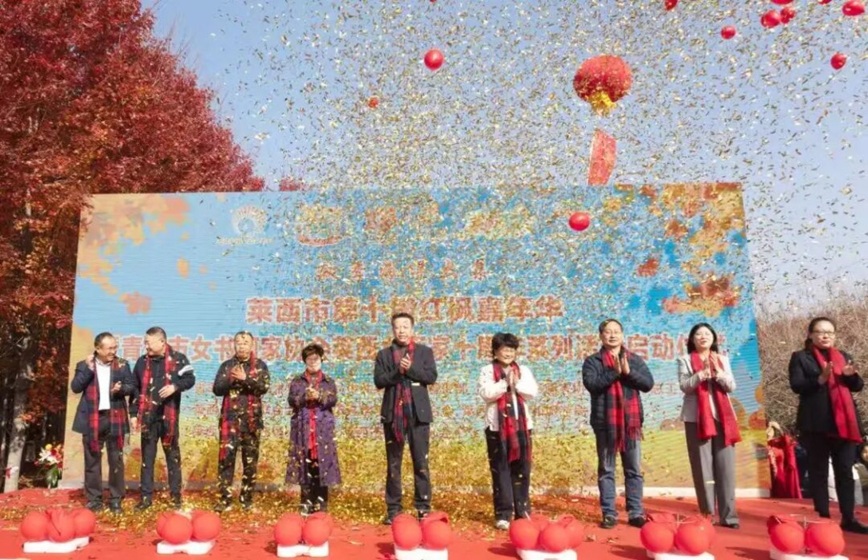 层林尽染迎宾客,翩翩枫叶满枝红。11月1日,莱西市第十届红枫嘉年华暨青岛市女书画家协会莱西女画家十周年系列活动在夏格庄镇千亩枫林启幕。山东文化产业职业学院美术与艺术设计学院艺术与设计传统工艺创新工作室30余名学生参与此次活动,以专业实践助力文化传播,在秋日枫景中搭建“课堂与实践”的桥梁。