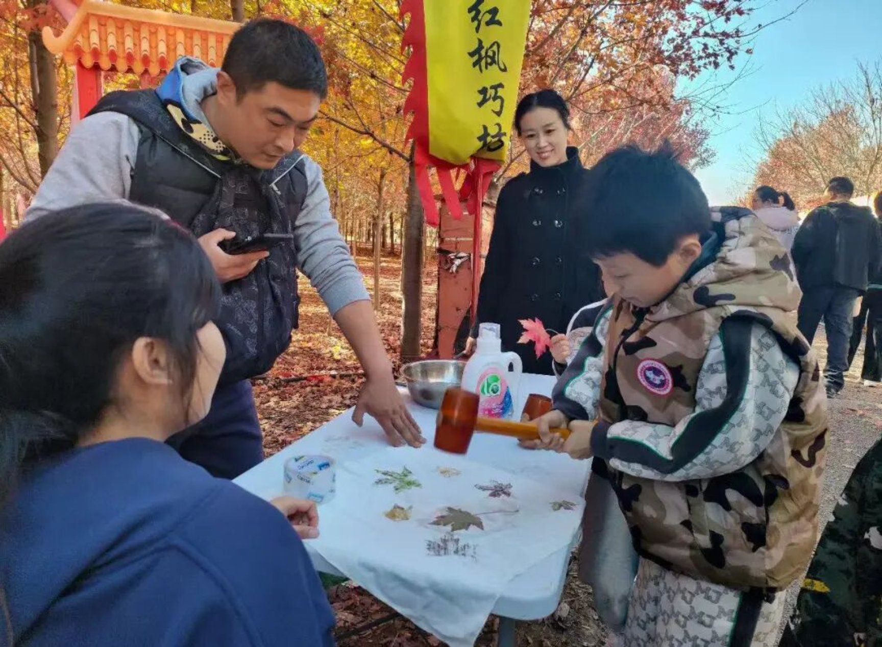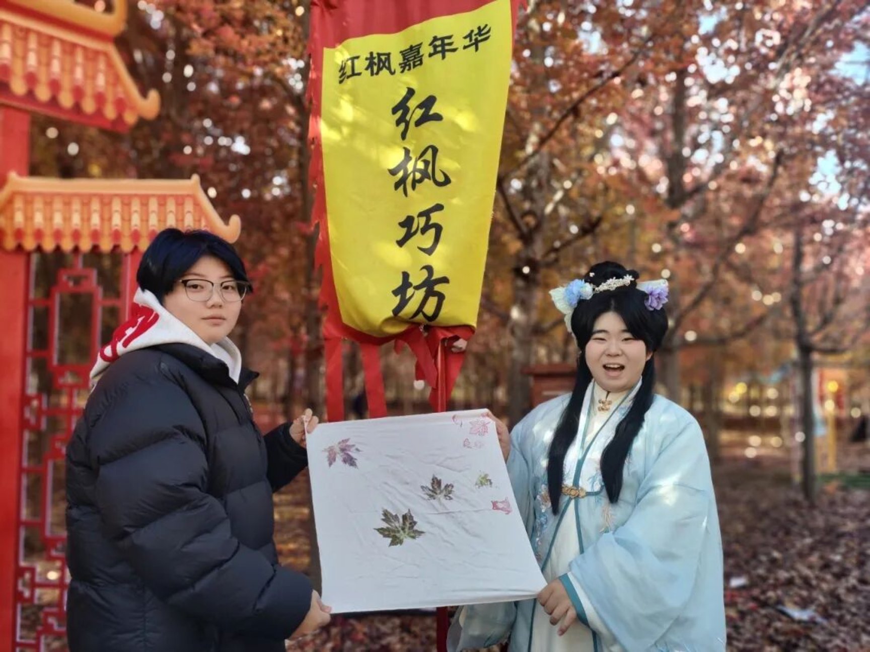 本届红枫嘉年华由莱西市文联、莱西市女书画家协会、夏格庄镇政府联合打造,以“枫韵千年,枫情万种”为主题,融合观赏、学习、游乐等多元体验。作为活动的重要参与力量,美术与艺术设计学院学子围绕非遗文化传承、文体活动服务两大板块深度参与,将专业所学与传统文化、自然美学紧密结合,成为现场一道亮眼的青春风景线。