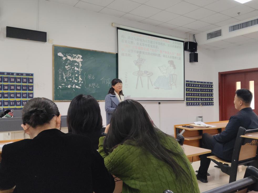 在核心分享环节,隋教授从文学与生活审美、文学与职业审美两个方面围绕文学审美向人生实践的转化路径展开深度剖析,倡导将文学审美融入日常点滴,并聚焦学院专业特色,提出两大融合方向,为商贸与新媒体专业教师提供极具实操性的发展思路。